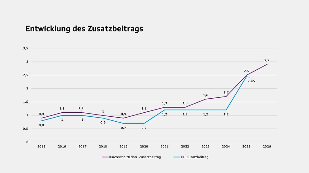 Liniendiagramm mit dem Titel 'Entwicklung des Zusatzbeitrags'. Die x-Achse zeigt die Jahre von 2015 bis 2026, die y-Achse die Werte von 0,5 bis 3,5. Zwei Linien verlaufen über die Jahre: eine violette Linie für den 'durchschnittlichen Zusatzbeitrag' und eine blaue Linie für den 'TK-Zusatzbeitrag'. Beide Linien zeigen von 2015 bis 2023 einen relativ stabilen Verlauf zwischen 0,7 und 1,3, steigen dann ab 2024 steil an. 2026 erreicht die violette Linie 2,9, die blaue Linie 2,45.